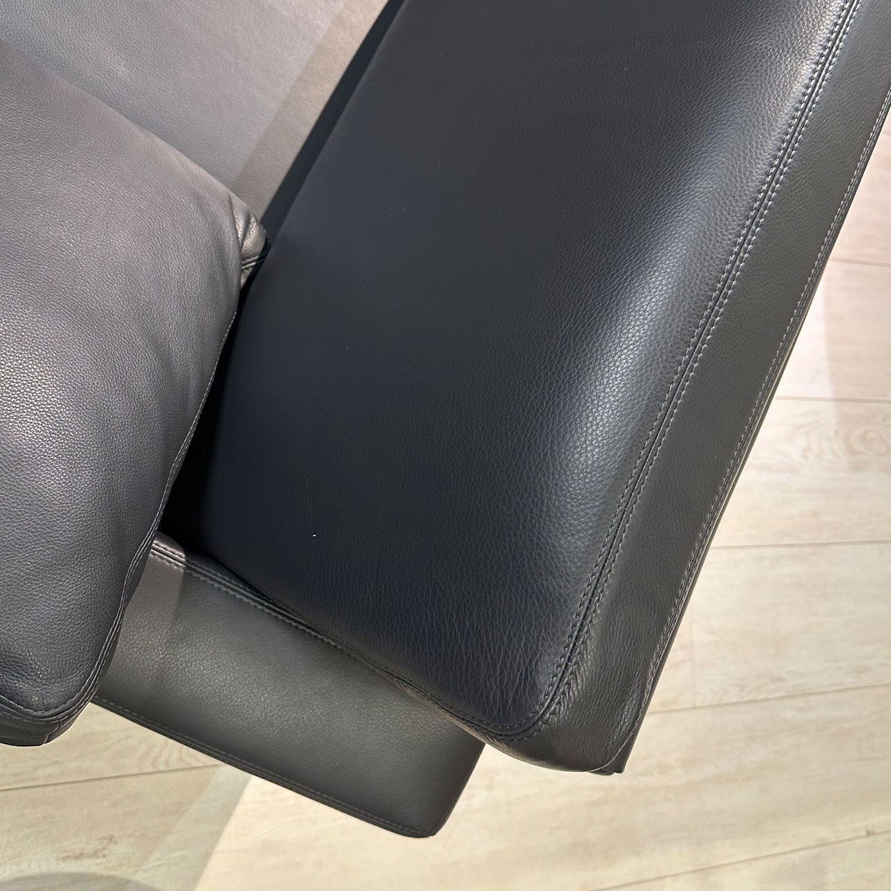 Modernes graues Leder-Sofa mit zwei Armlehnkissen.